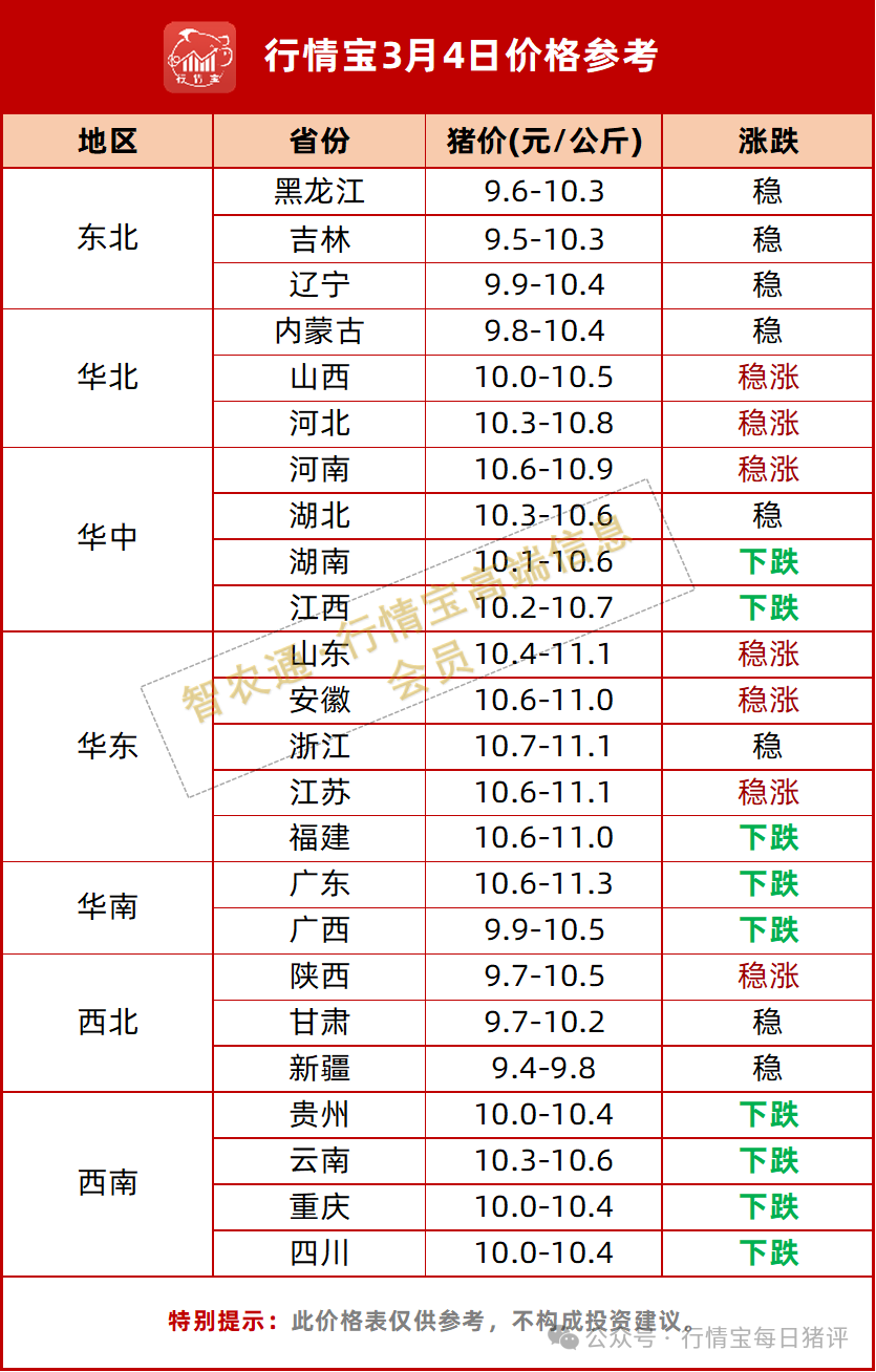 3月3日智农通 APP行情宝数据显示,今日全国生猪均价为10.47元/公斤,与昨日相比价格下跌0.10元/公斤,月环比下跌16.3%,同比下跌28.9%。